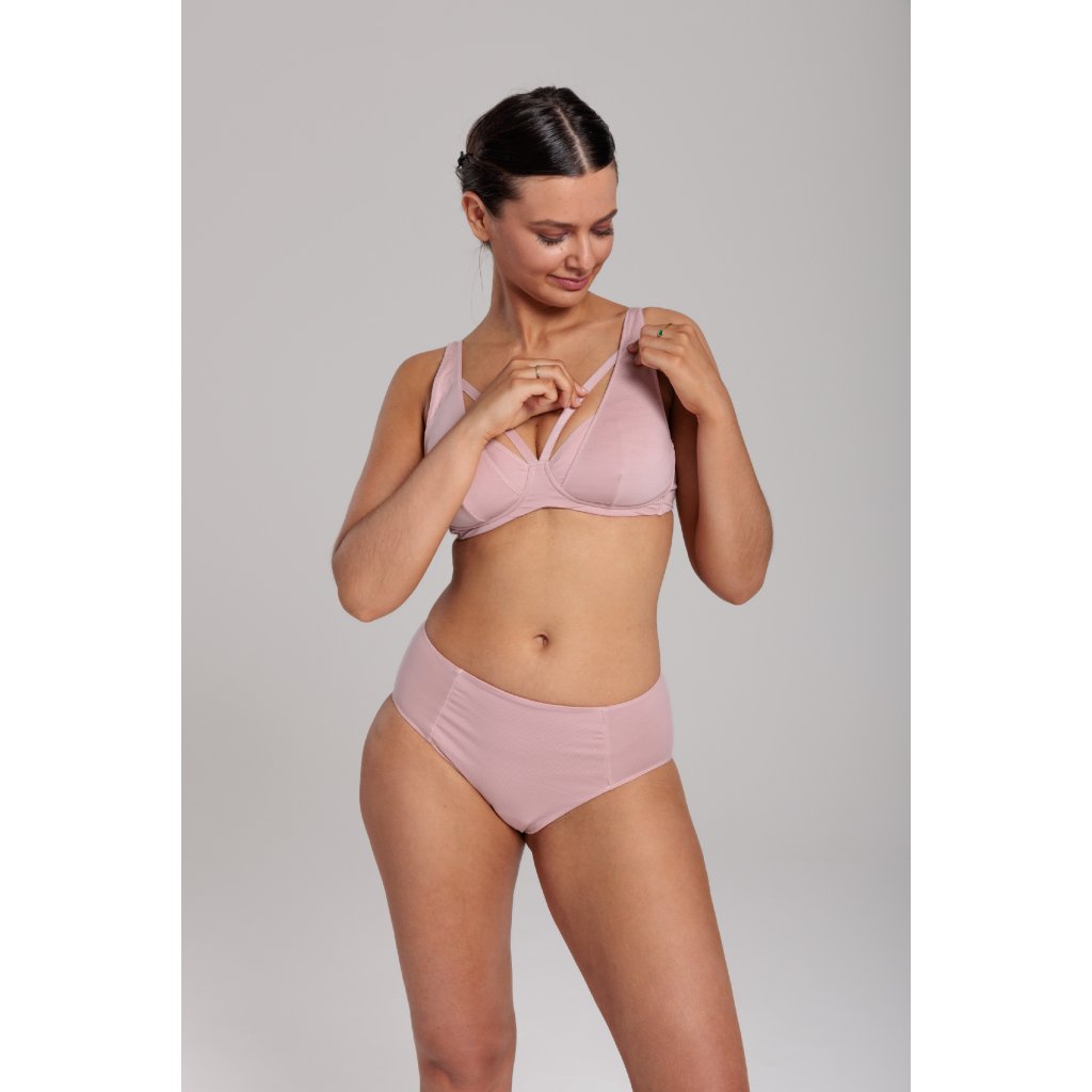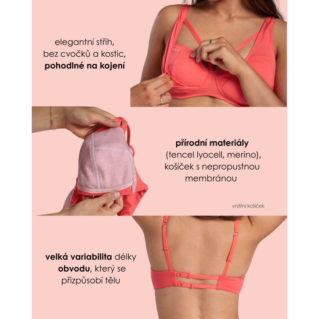 První kojící podprsenka s tvarovanými košíčky a membránou. Spojuje pohodlí, funkčnost a ženskou eleganci. Díky diskrétní nepropustné vrstvě už nepotřebuješ vložky do podprsenky a můžeš se cítit krásně a sebevědomě každý den.