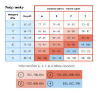 První důležitý rozměr je obvod pod prsy. Pokud vám vyjde míra mezi dvěma velikostmi, doporučujeme zvolit menší obvod a větší košíček.