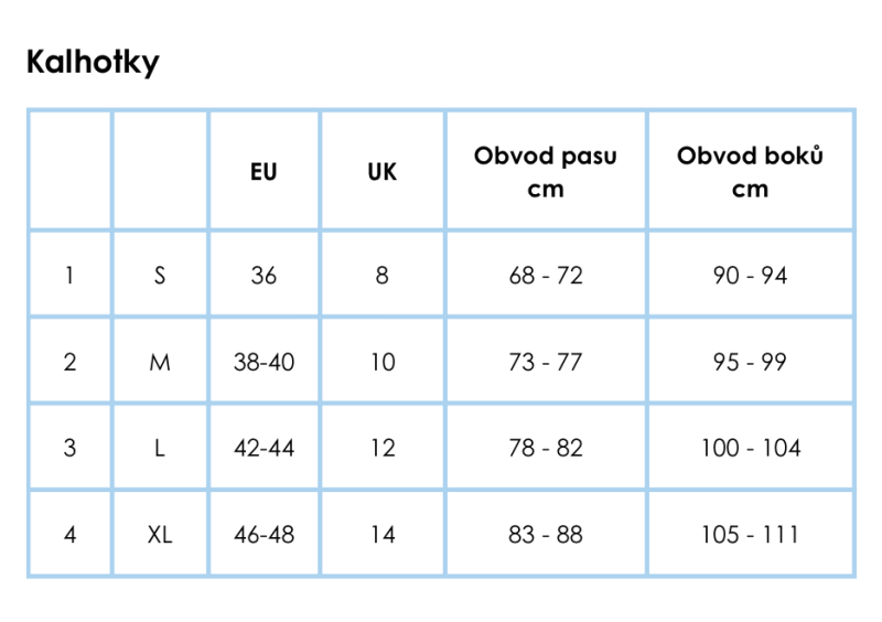 Správná velikost je klíčem k pohodlí i dlouhé životnosti Tvého prádla. Naše střihy a funkční vrstvy se liší od běžného spodního prádla, proto jsme připravily vlastní číslování (1-4), které Ti pomůže vybrat perfektní padnoucí kousek.